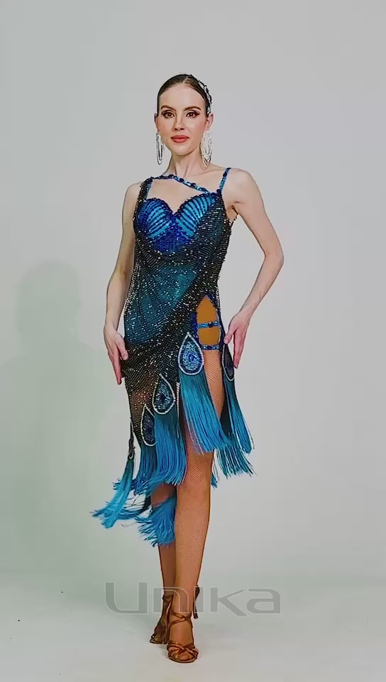 The sleeveless( it can be long sleeves) open-back peacock Latin dress is available in various colorswith pairing earrings. This dress, inspired by the peacock has Austrian rhinestone and crystal net and beaded fringe detailing to enhance dance movements- Shining brilliant light on the dance floor.