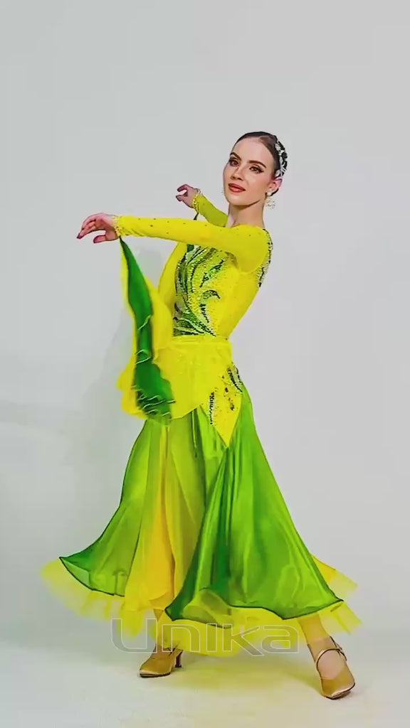 Long-sleeved ballroom dress with a higher V cut back and  Austrian rhinestones detailing. Japanese satin chiffon fabric. Coming in multiple colours, this lovely dress has beautiful contrast detachable floats ( can be long or short) to enhance dance movements and a skirt that has an eye-catching colour gradient.
